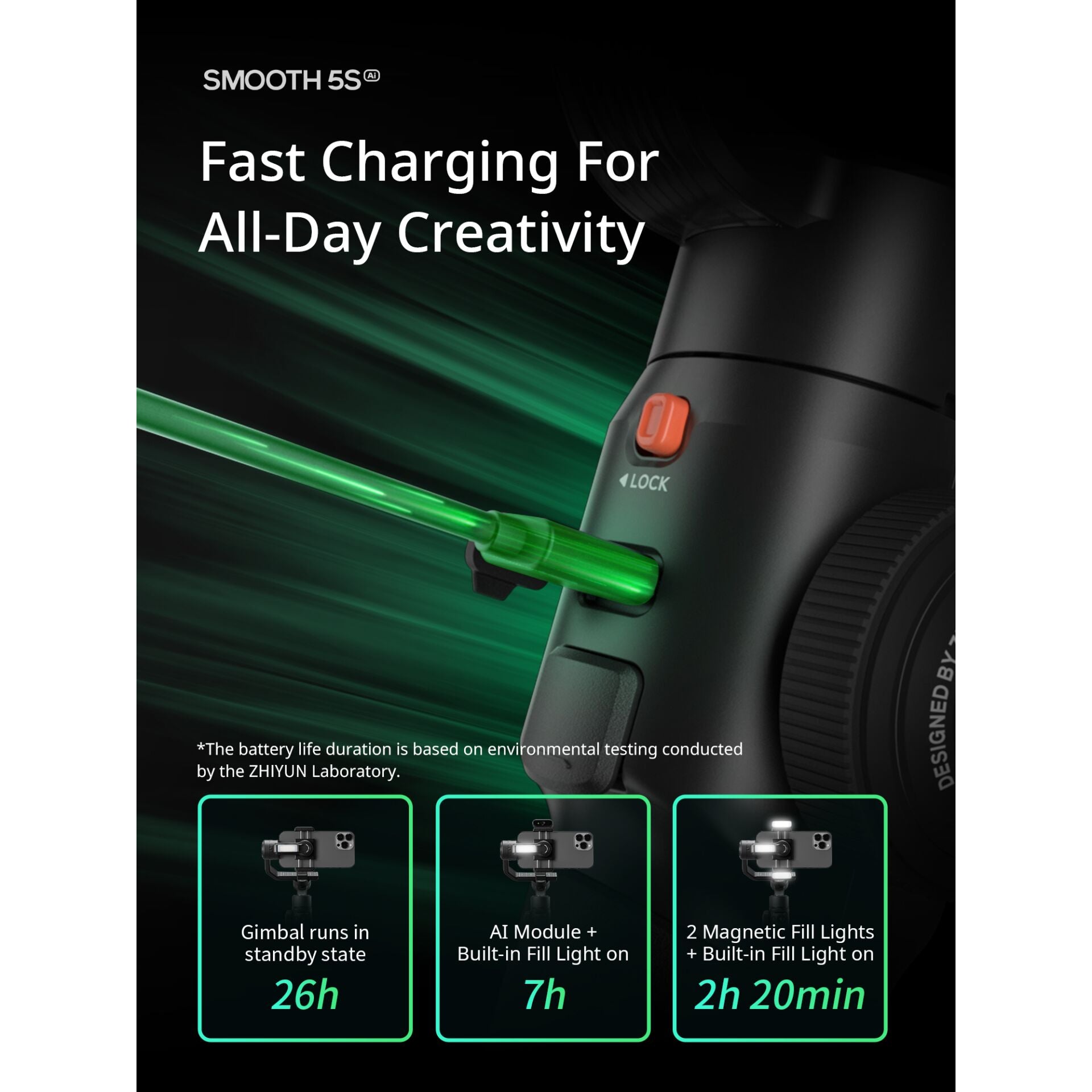 Met een indrukwekkende werktijd van 26 uur kun je de hele dag door filmen zonder je zorgen te maken over het opladen. Bovendien is de gimbal in slechts 3,5 uur volledig opgeladen, zodat je snel weer aan de slag kunt. Het slimme ontwerp maakt het eenvoudig om de gimbal aan te sluiten op je smartphone via de 1/4" schroefdraad, wat zorgt voor een stevige bevestiging.