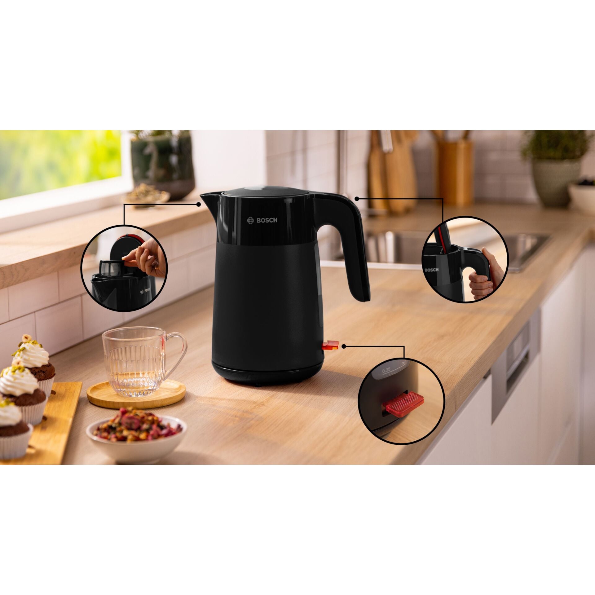 Met zijn stijlvolle zwarte kunststof behuizing is de Bosch TWK 2M163 MyMoment niet alleen functioneel, maar ook een stijlvolle aanvulling op je keuken of reisuitrusting. De cordless functie maakt het eenvoudig om hem overal te gebruiken, zonder gedoe met snoeren.