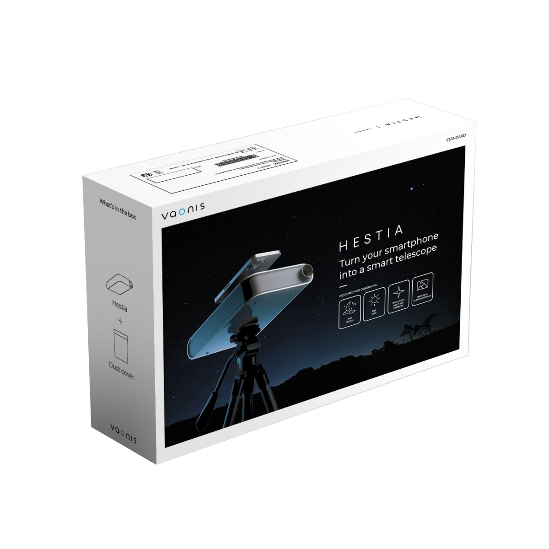 Ontdek de Vaonis Hestia Essential, een baanbrekende telescoop die de sterrenhemel binnen handbereik brengt. Deze innovatieve en gebruiksvriendelijke telescoop is perfect voor zowel beginnende als ervaren sterrenkijkers. Met zijn strakke ontwerp en geavanceerde technologie biedt de Hestia Essential een ongeëvenaarde kijkervaring.