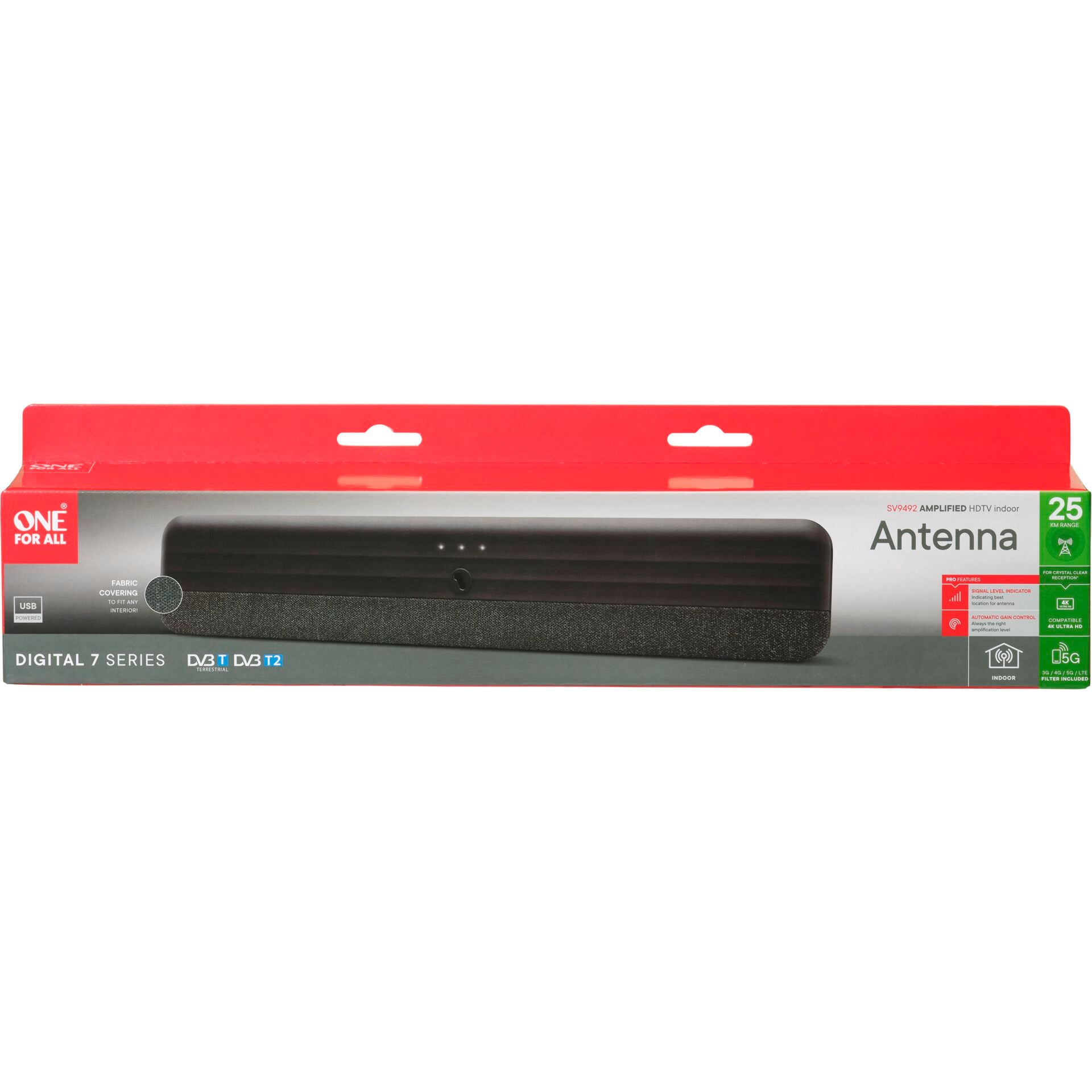 Wacht niet langer en upgrade uw televisie-ervaring vandaag nog! Bestel de One for All DVB-T2 Fabric 5G BAR Antenna met USB SV9492-5G nu en geniet van de toekomst van digitale televisie.