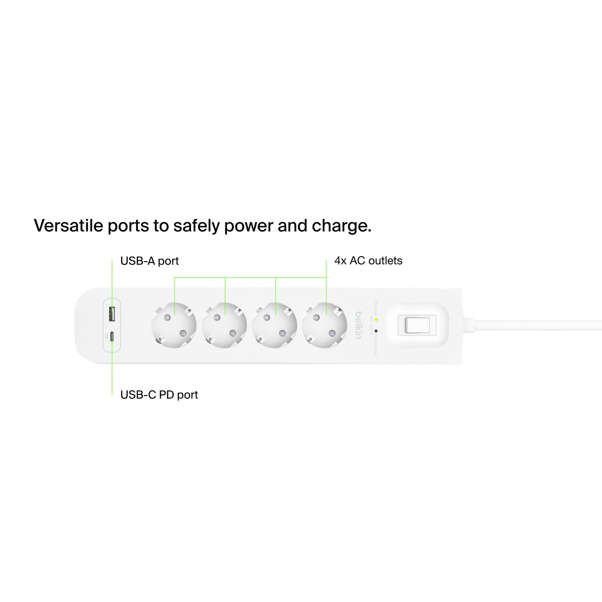 Met vier stopcontacten en twee USB-poorten (een USB-A en een USB-C), biedt deze stekkerdoos voldoende ruimte voor al uw elektronische apparaten. Of het nu gaat om uw laptop, smartphone of tablet, u kunt ze allemaal gelijktijdig aansluiten en opladen zonder gedoe.