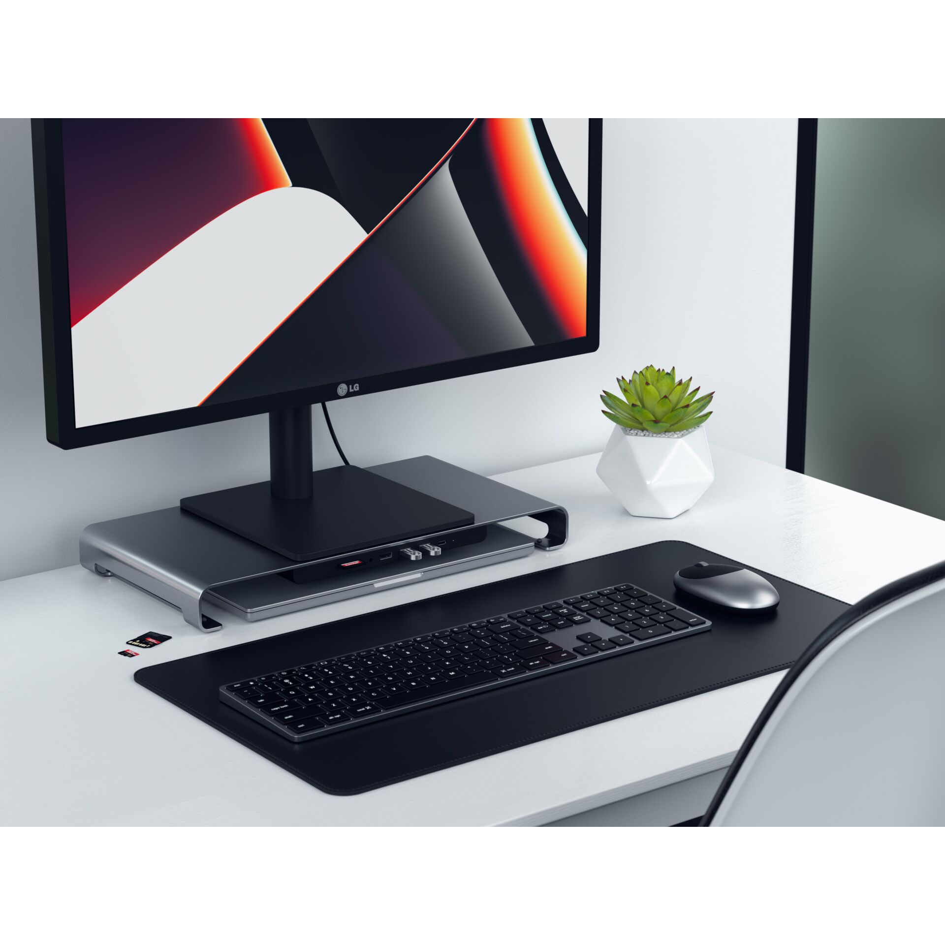 - Optimalisatie van de werkruimte: Houd je bureau georganiseerd door accessoires onder de standaard op te bergen.